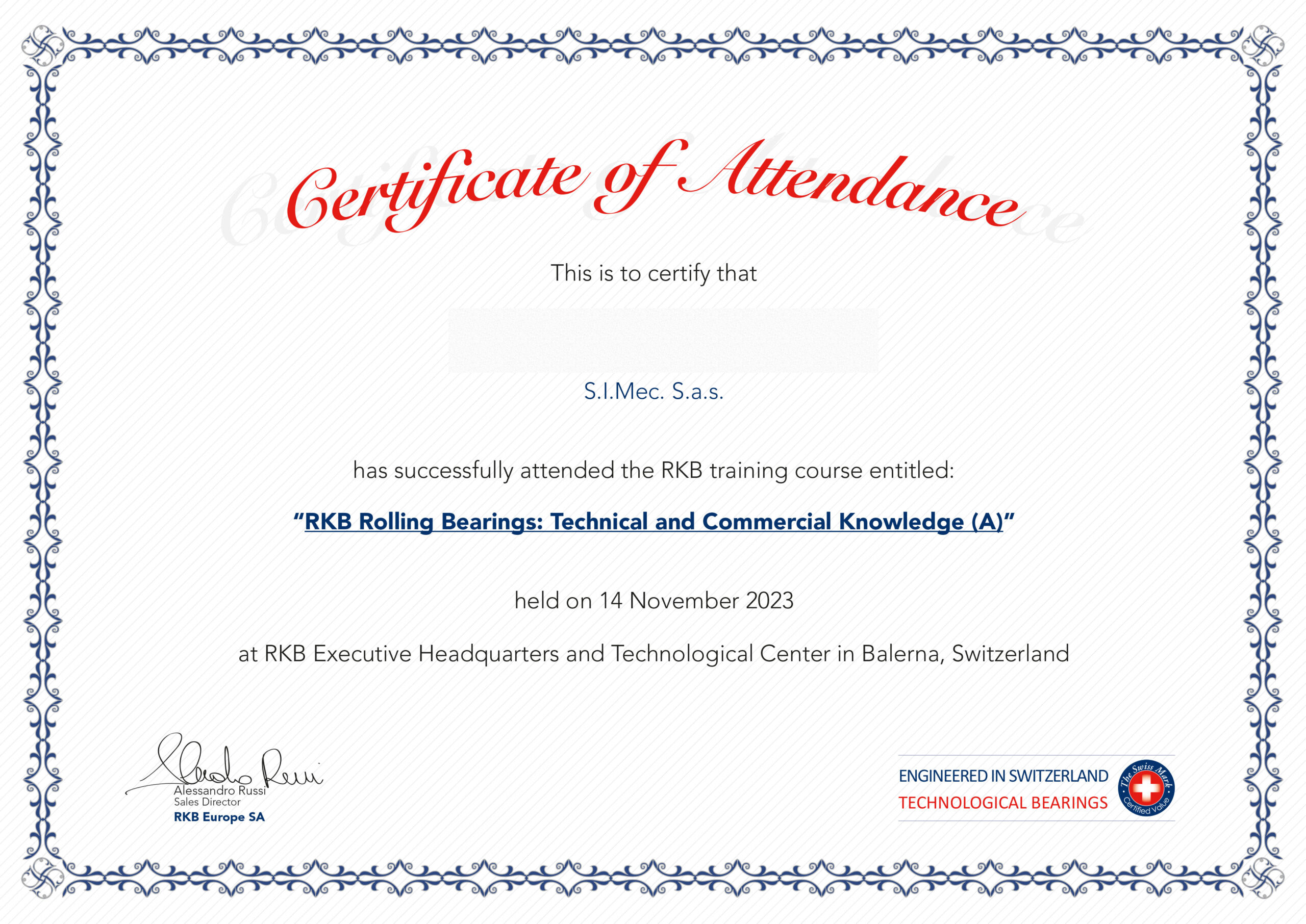 S.I.MEC ha partecipato con successo al corso di formazione “RKB Rolling Bearings: Technical and Commercial Knowledge (A)” presso la sede RKB in Svizzera. Un riconoscimento che conferma l’impegno continuo nella crescita tecnica e commerciale, a garanzia di un servizio sempre più competente e qualificato.